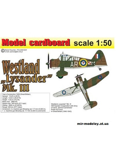 №10811 - Легкий вспомогательный самолет Westland Lysander Mk III (Model cardboard) из бумаги