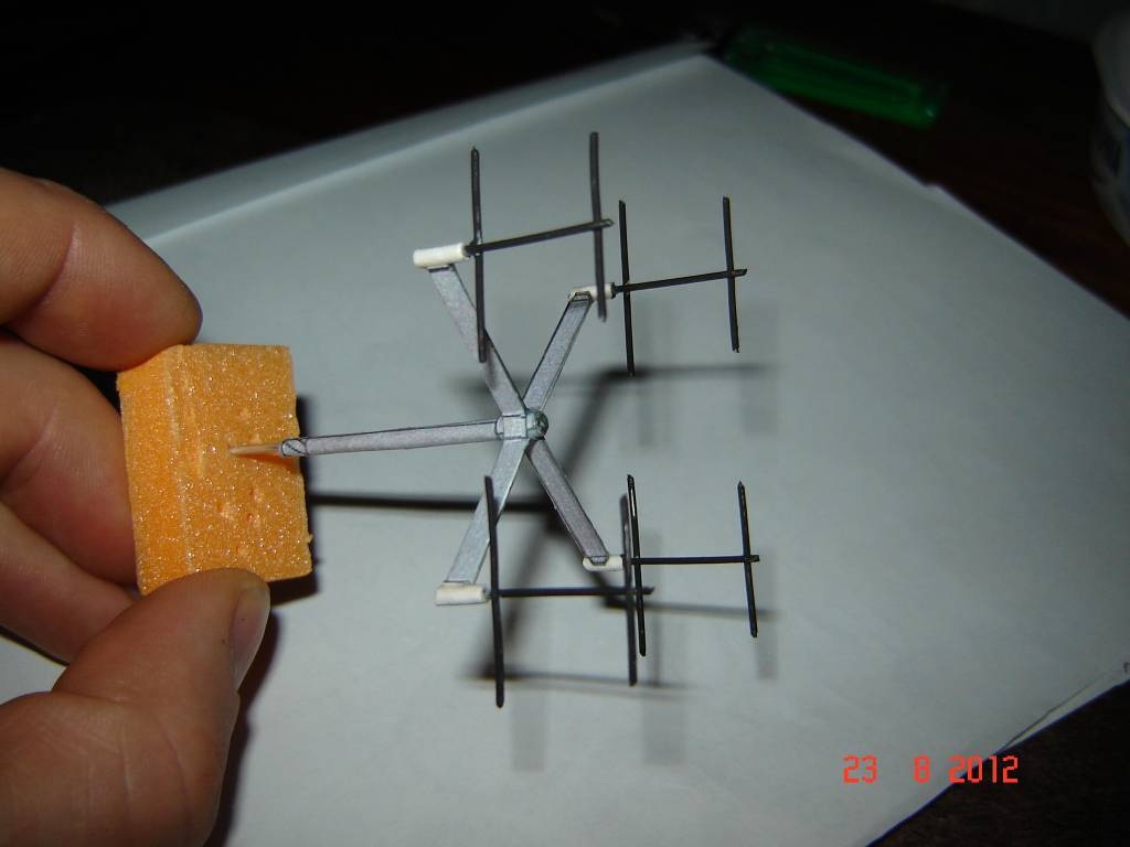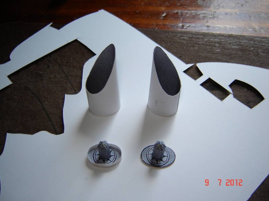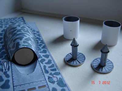 носовую стойку буду делать из проволоки с картоном, как советует первоисточник. Добавлю к гондолам выходные устройства движков с турбинами. Накрутился цилиндров с конусами.....