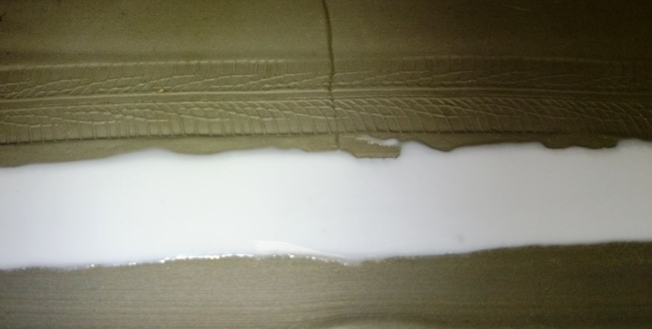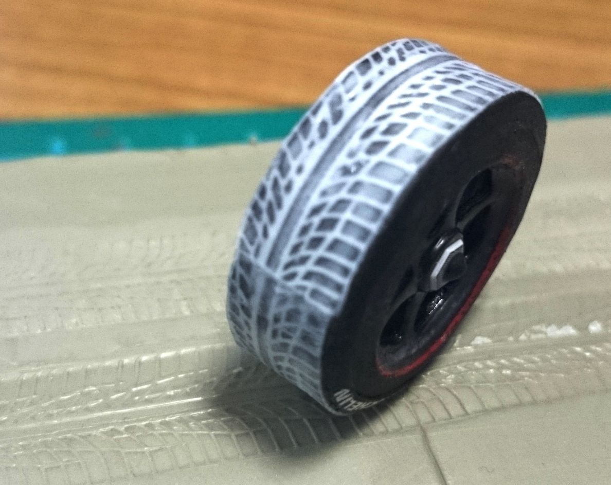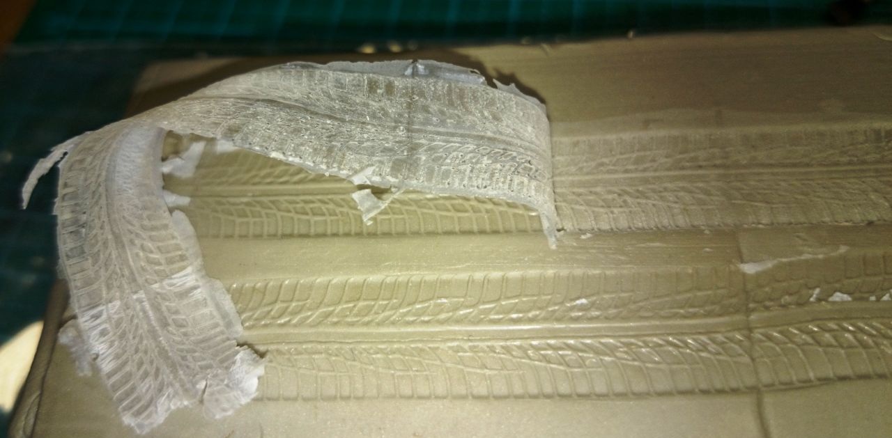 немного о процессе: на пластилине делал слепок протектора прокатывая резиновым колесом от пластиковой модели, след заливал ПВА
