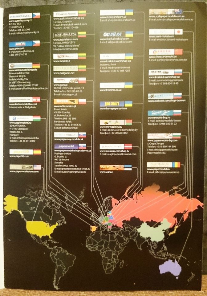 На внутренней части обложки приведено небольшое описание истории данного авто на двух языках, и несколько примечаний по подклейке деталей на картон. На другой половине нарисована карта мира со сносками где какие издательства и магазины находятся и собственно ссылки на их сайты. (думаю такая карта есть в каждом журнале от данного издателя