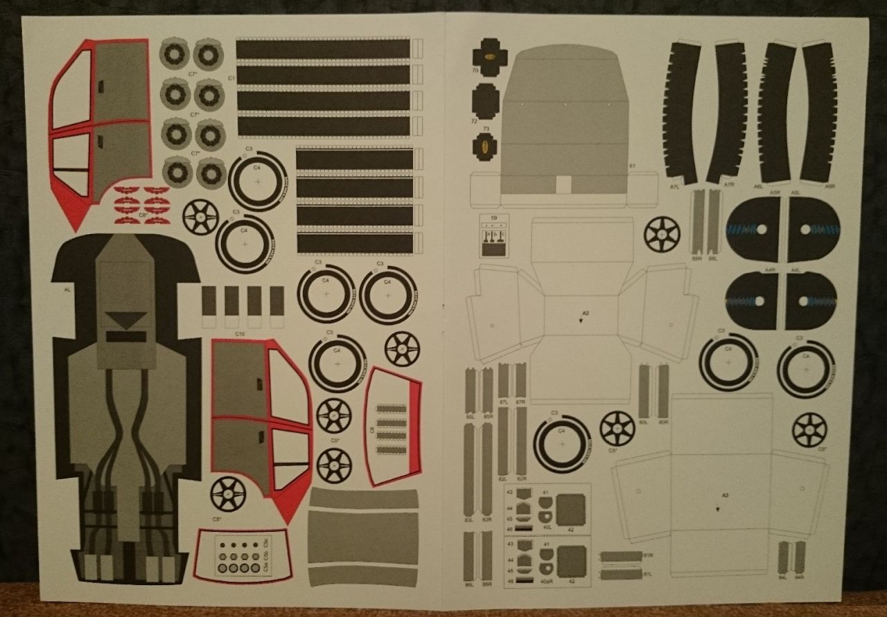 3. Выкройки. Занимают всего 4 листа, печать хорошая, бумага тоже, плотность примерно 160гм, не слоится, при загибе не рвется. Но есть один маленький недостаток, на черных деталях таких как протектор колес, отпечатанный рисунок можно сказать не видно. я его разглядел с большим усилием, так что проще сказать что его нет, чем пытаться увидеть