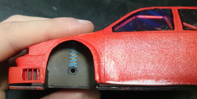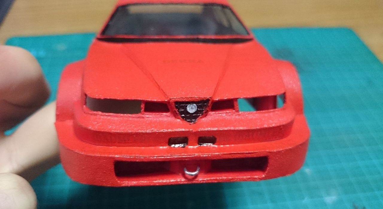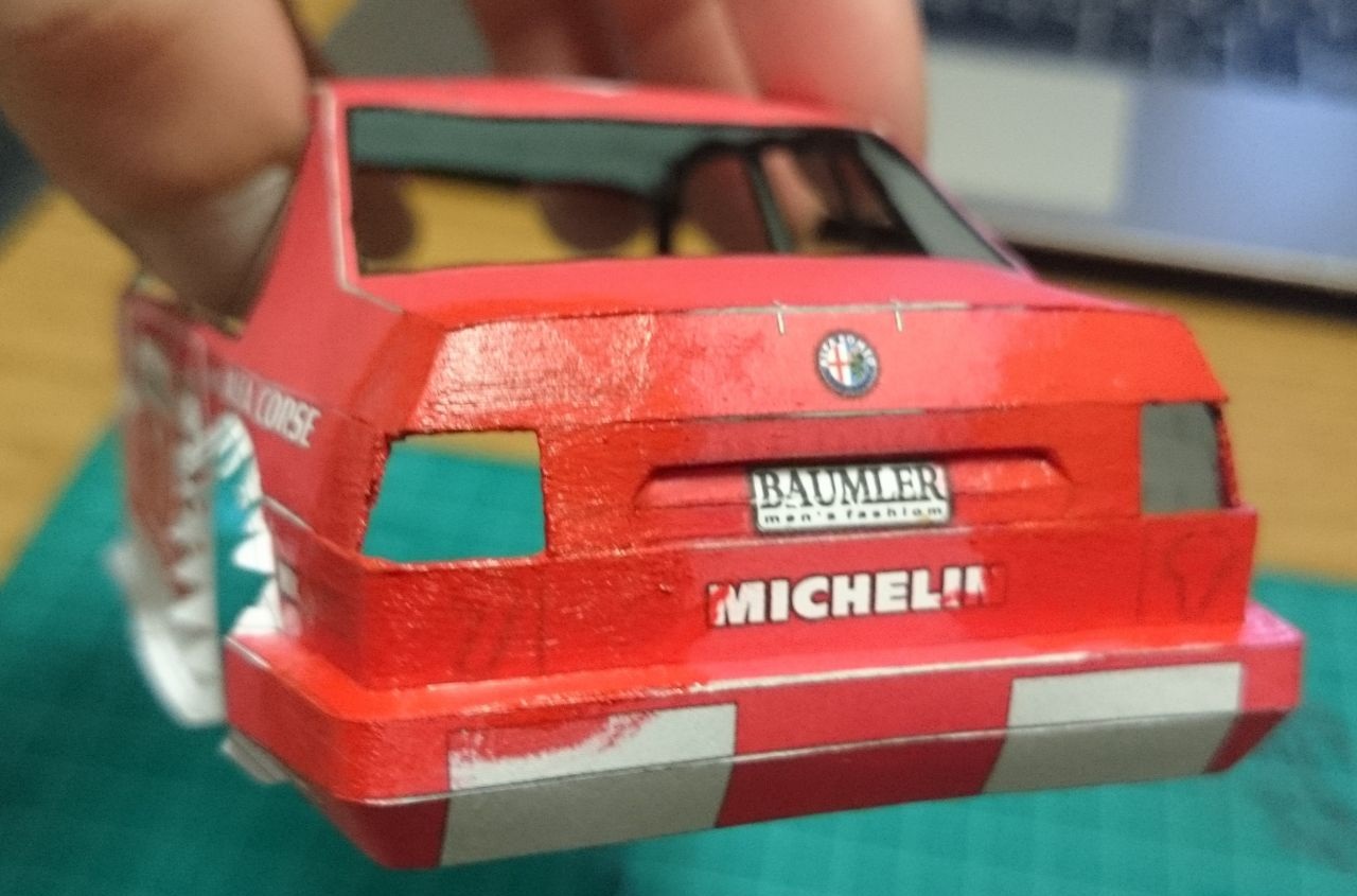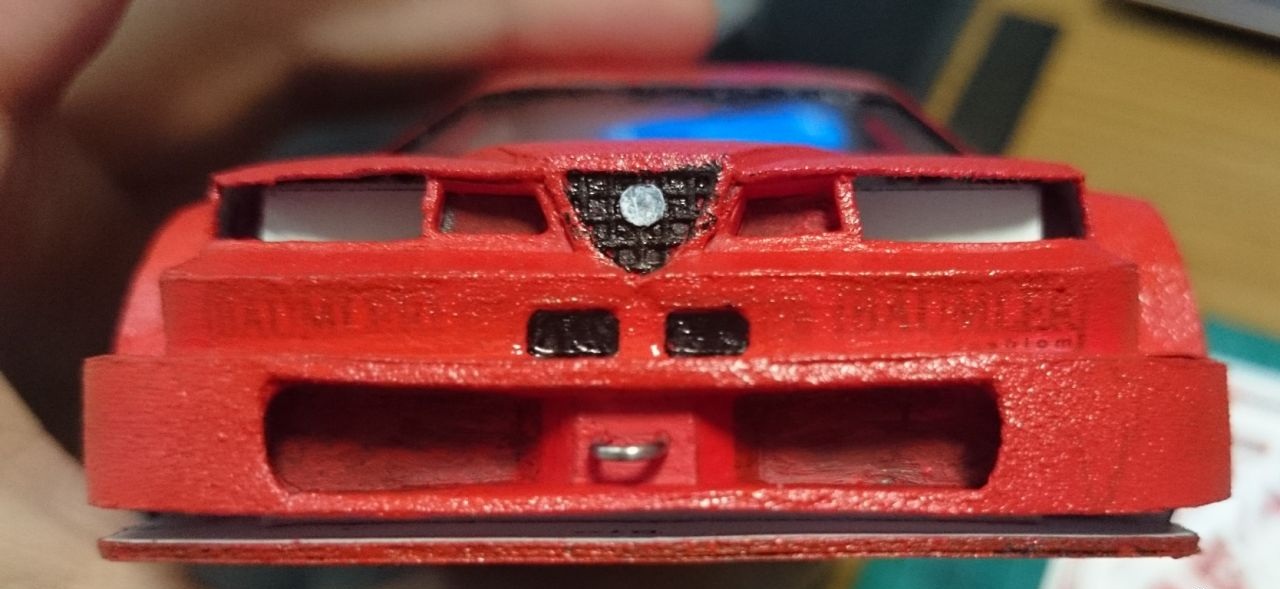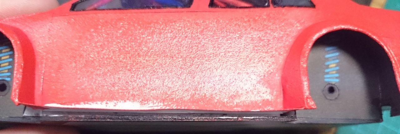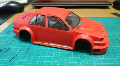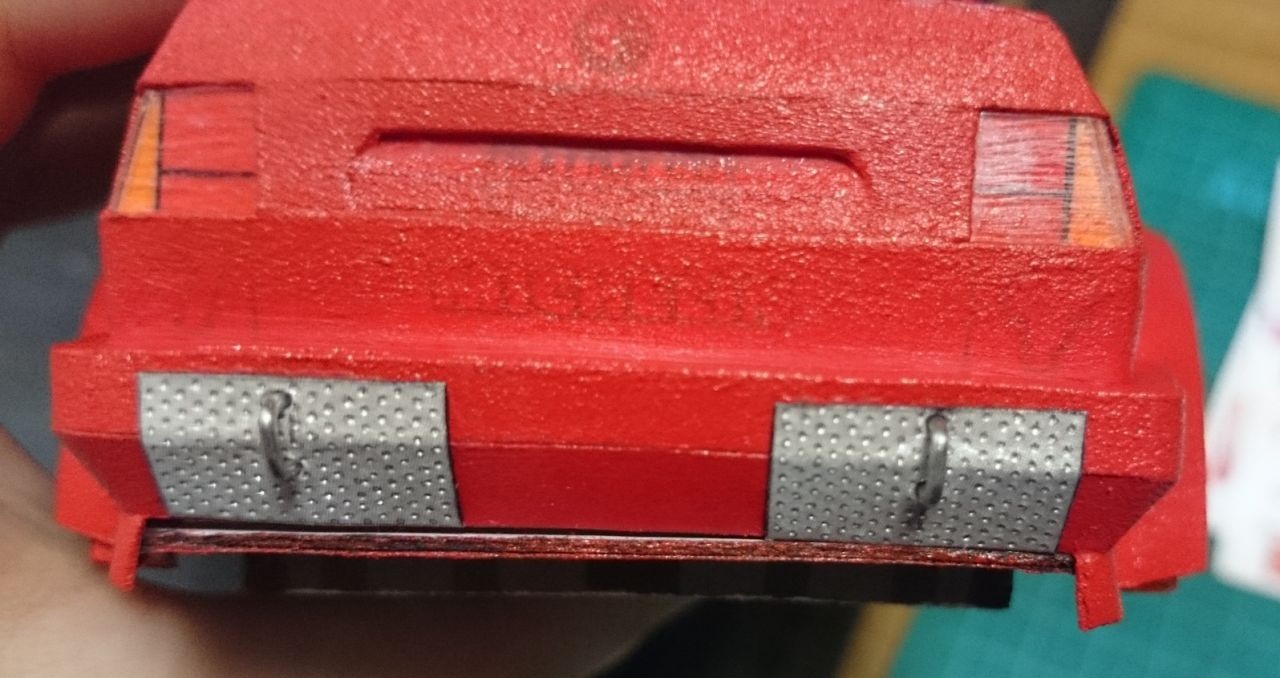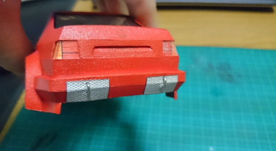 Еще немного подсобрал "зад", немного "морду", а так же прорезал отверстия под задние фонари и попробовал окраску, сначала красной матовой, потом глянцевой в один слой.