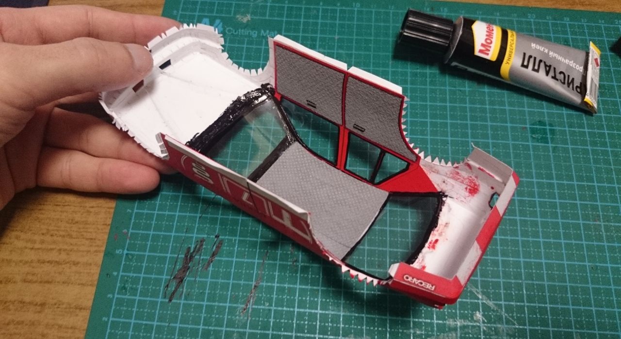 1. сделал внутреннюю обшивку дверей и крыши, приклеил на свои мета