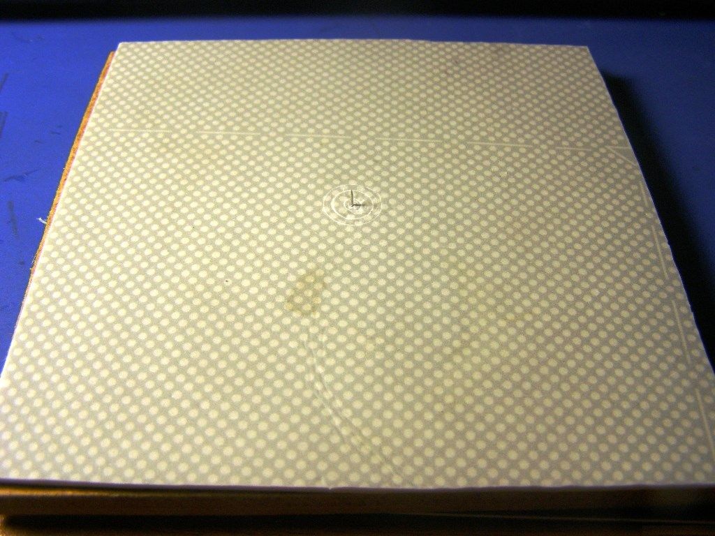 Это основание, примерно 14х14 см, толщиной 2 см из фанеры. свержу для удобства резки кусок линолеума (можно и кусок коврика). В середине установлена игла.